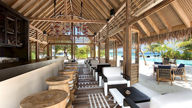 Les chambres sont inspirées des bateaux dhoni locaux en bois blanchi avec des toits de kajan. Ils sont accessibles par des passerelles en planches s'étendant dans le lagon chaud.
