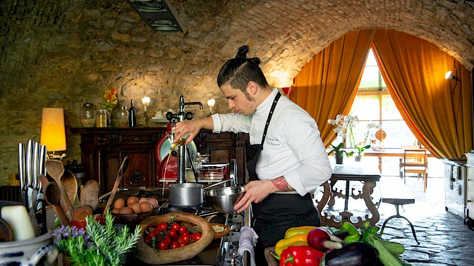 Les repas sont inspirés par une gastronomie italienne simple et à base d’ingrédients locaux. Tous les légumes sont cultivés sur le domaine, et les vins sont également faits maison. Le domaine est naturellement entouré d’oliviers et de forêts, créant un environnement des plus relaxants pour ressourcer à la fois le corps et l’esprit.